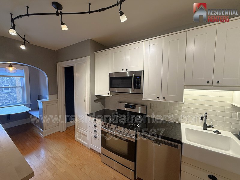 • Stainless steel refrigerator, gas stove, microwave, and dishwasher
